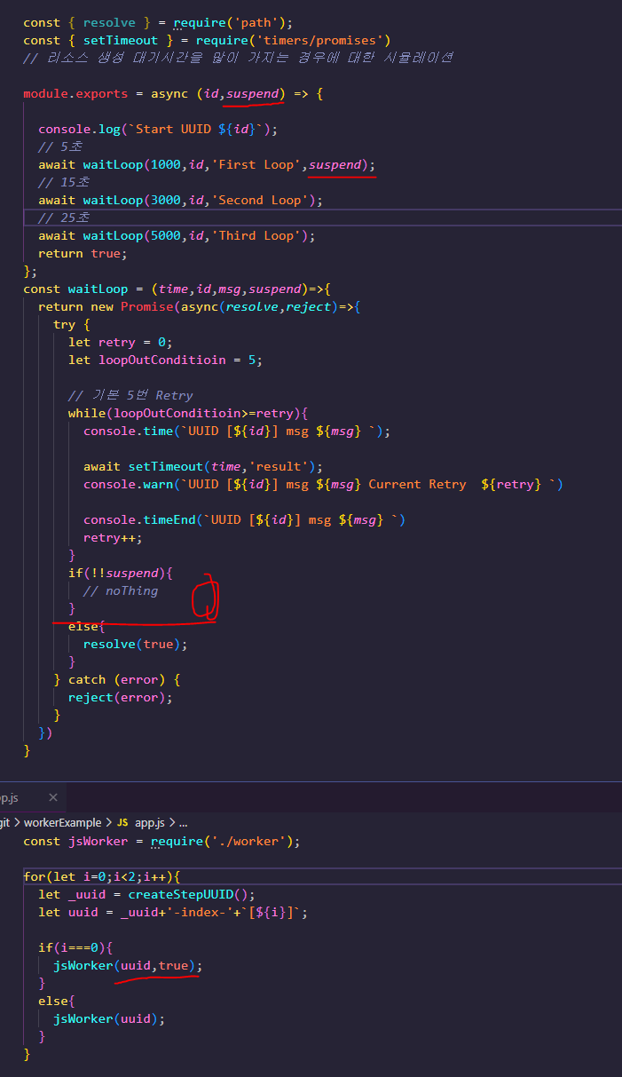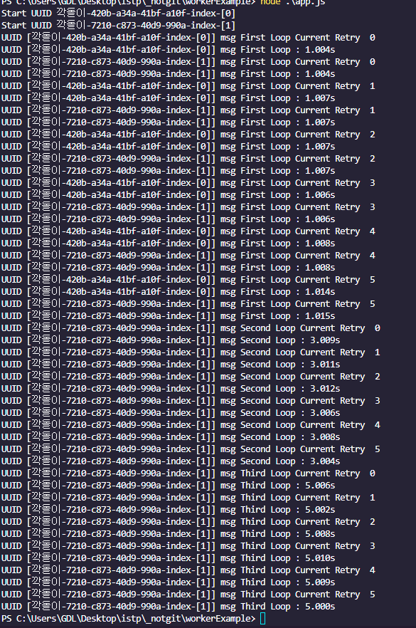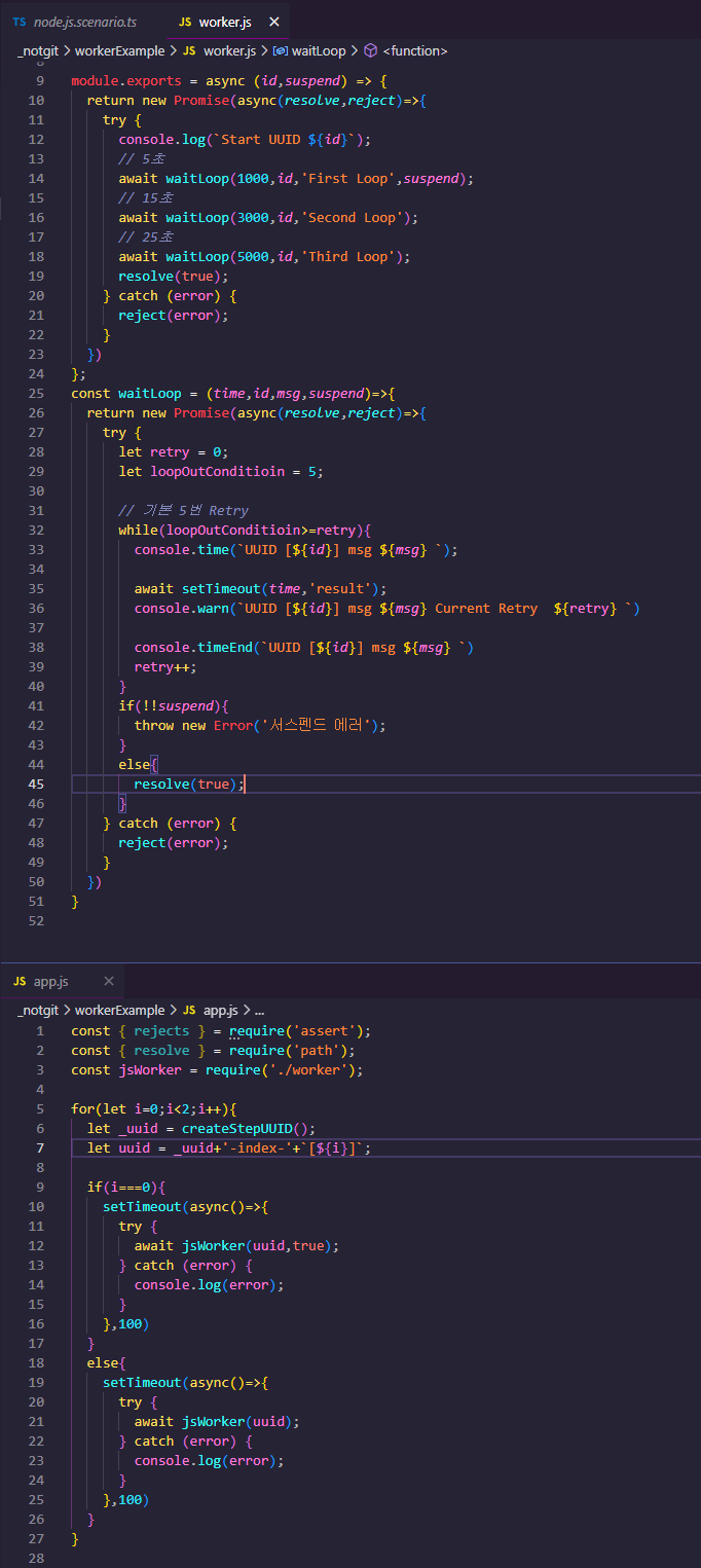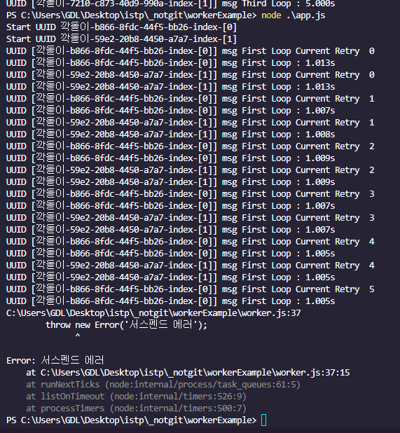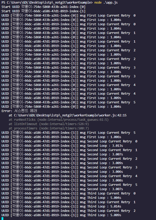 네 타이머 페이즈에서 해결할수 있었습니다. Event Loop 가 계속 돌면서 타이머 페이즈에 는 계속 등록된 함수들이 있게 되고 ( Worker ) Event Loop 가 돌면서 계속 실행됩니다. 하지만 테스트 플랫폼의 초기 단계이기도 하고 API 테스트의 구조는 비동기 형태로 단순 Request , Response 에 대한 결과를 검증 하기 때문에 큰 문제는 되지않았지만 ( 이것도 케이스가 수천건이 넘어가면 이슈가 생길듯 )