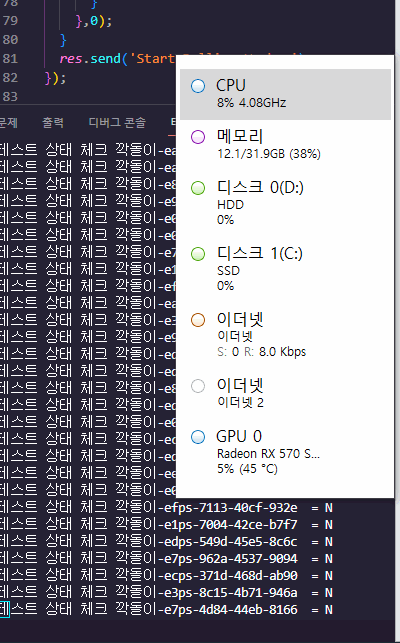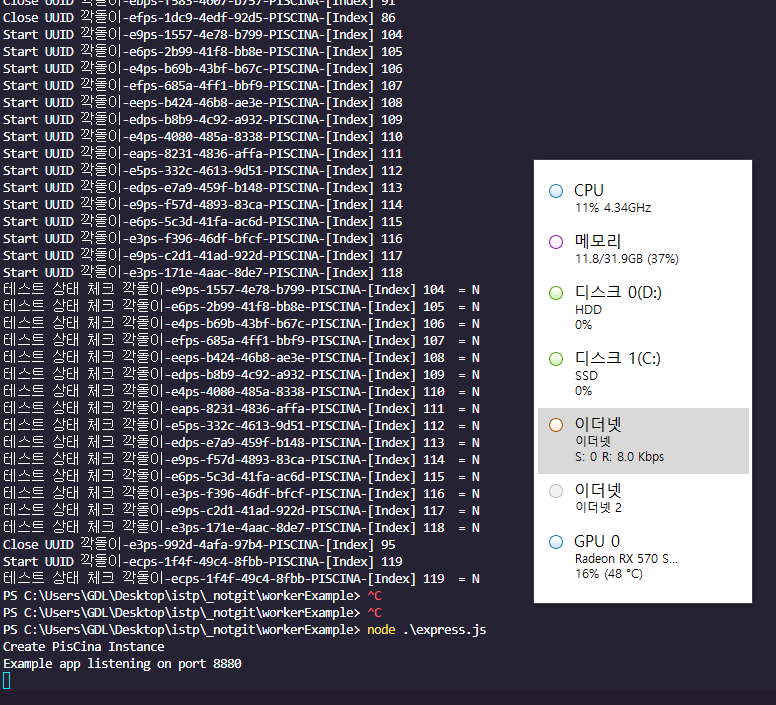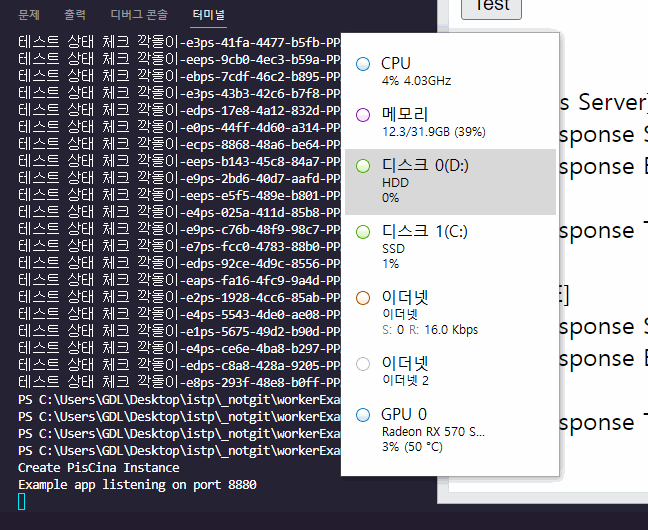 기본적인 로컬 PC의 CPU 개수만큼을 전부 사용 하는 모습입니다. 실제로 서버에서 요청도 다 받아 지는지 보겠습니다.