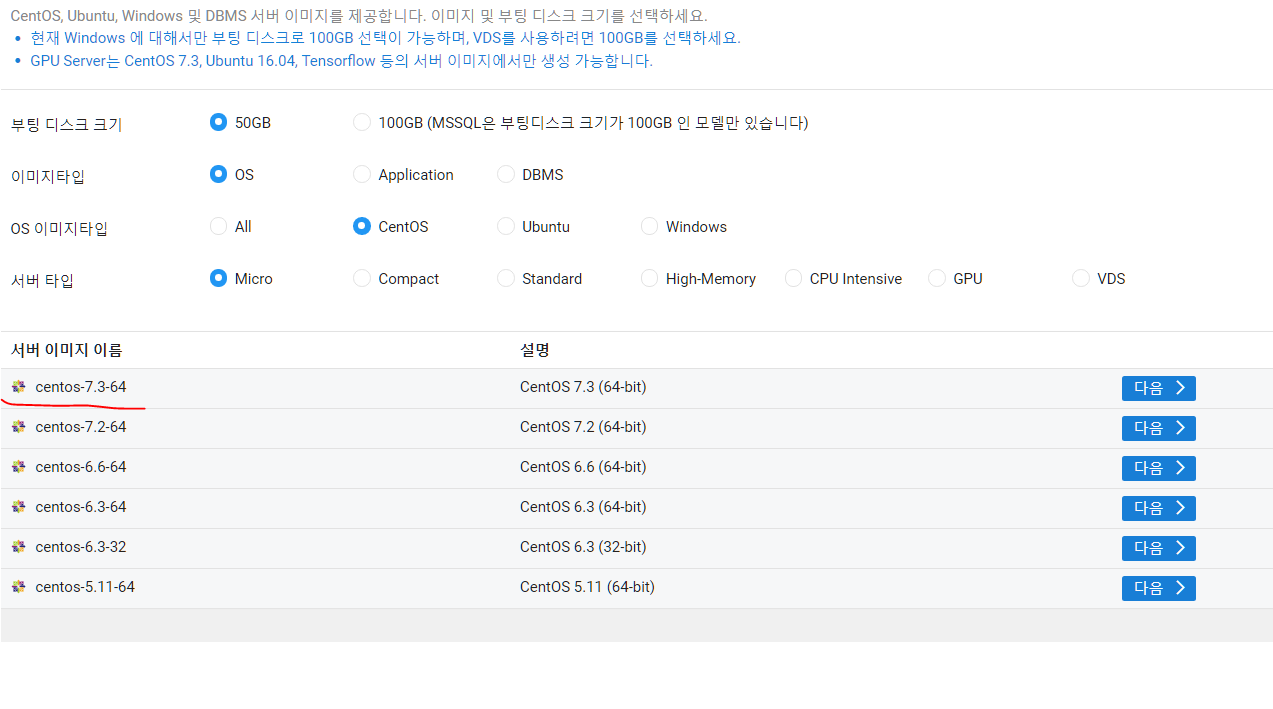 이 부분에서는 centos -7.3-64를 선택 할건데요
